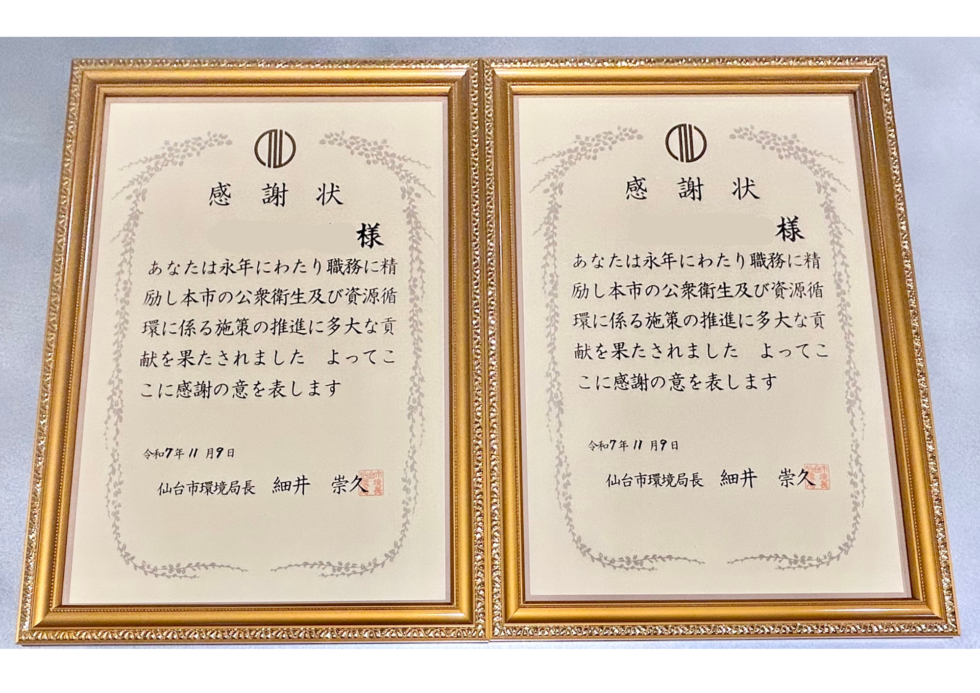 令和7年度「仙台市一般廃棄物処理に係る作業員に対する感謝状」をいただきました。