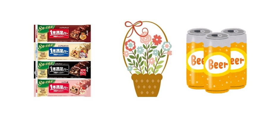 「シリアルバーセット」「素敵なお花」「ビール350ml 1ケース」