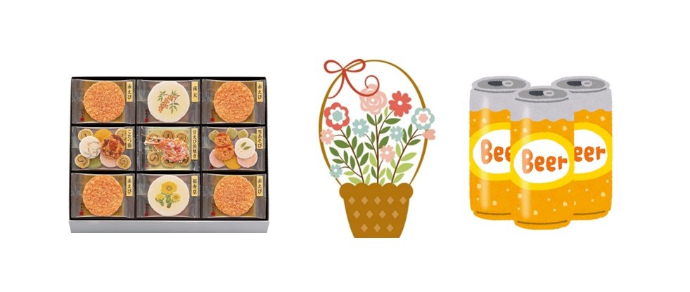 「お煎餅ギフト」「素敵なお花」「ビール350ml 1ケース」